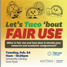 On Tuesday, Cindy Kristof, Kent State University Libraries’ copyright & scholarly communication librarian, hosted a taco-themed pop-up event to inform students on how we incorporate fair use into our work and recreational activities every day, featuring materials from FairUseWeek.org.