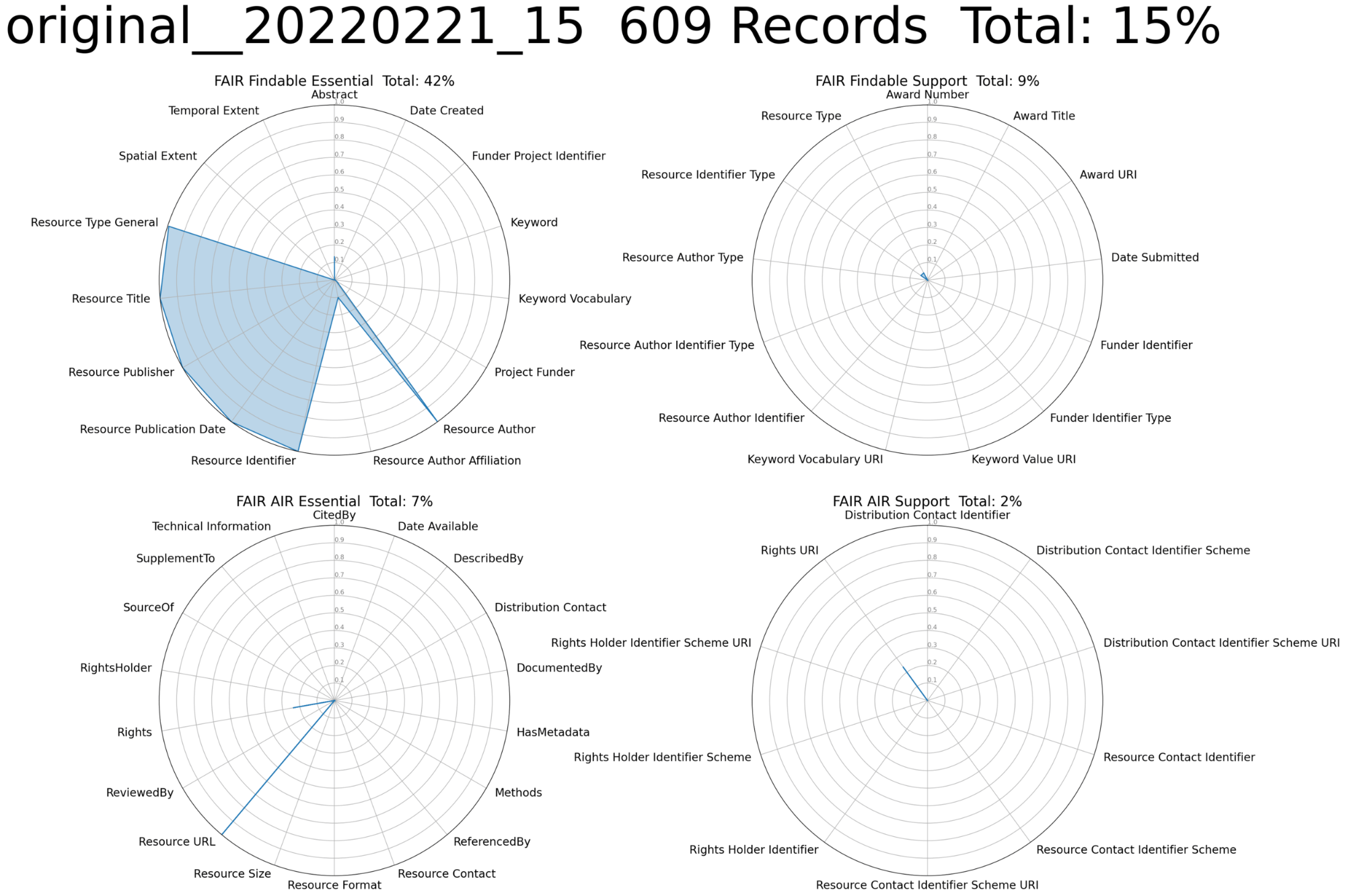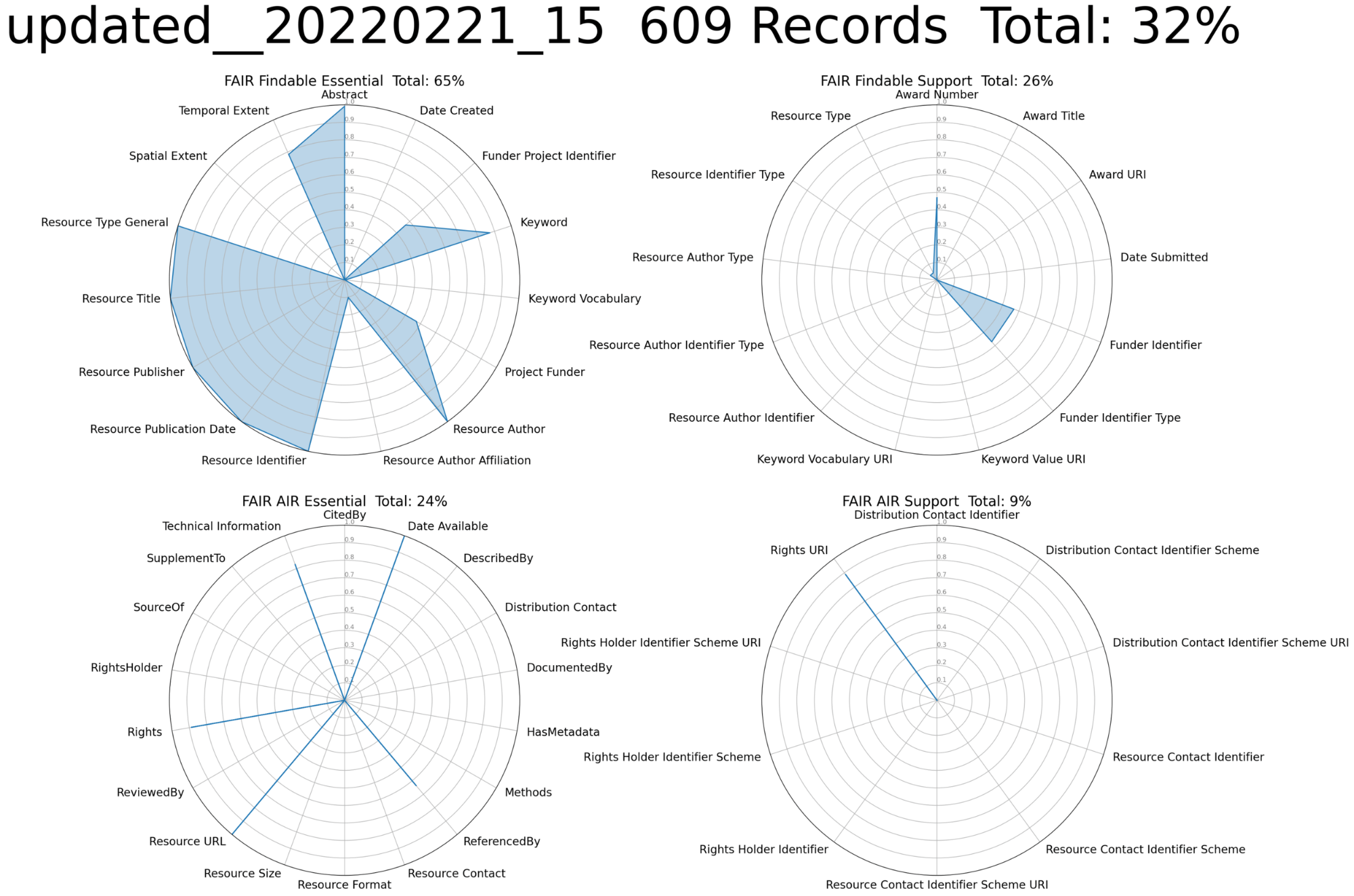 The content of these elements was extracted from the DRUM records, translated into the DataCite metadata schema, and used to update the DataCite metadata. Figure 5 shows the evaluation results for the updated records using the same criteria used with the original records. The completeness over all categories improved from 15% to 32%. Figure 5 shows visually striking improvements for many elements related to Findability in the upper left, but the size of the increases in the other categories, from < 10% to > 20% in two cases, are also significant, particularly because these are categories that are generally more difficult to populate.